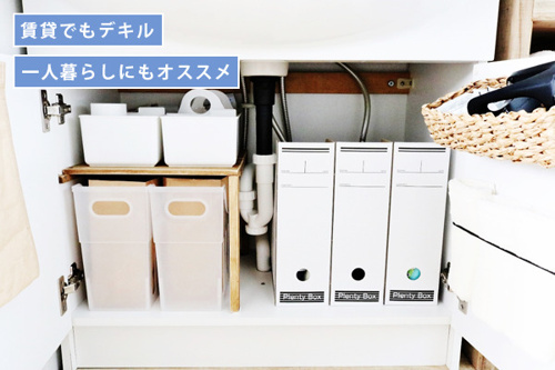 洗面台下は、排水管があるためスペースを有効活用しにくい場所です。 そこで、 ファイルボックスなどの収納グッズを上手く使うことがポイント。 またそれぞれのファイルボックスを、『洗剤などのストックボックス』、『ドライヤー収納ボックス』と カテゴリー分けをしておけば出し入れしやすく、ごちゃつきにくい収納になります。