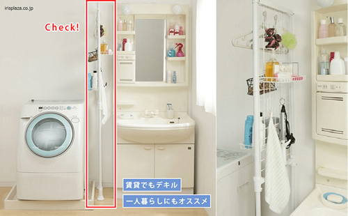 収納スペースが足りなくて、洗濯洗剤やクシなどの小物を置くスペースがない…。そんな時は、 突っ張り型のメッシュパネル「ランドリーメッシュラック」を活用しましょう!
