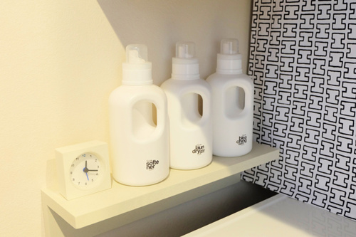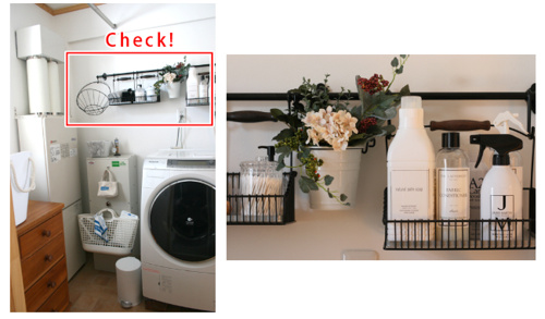 壁面にバーとカゴを取り付ければ、洗濯洗剤やスプレーボトルなどをおしゃれにスッキリ収納できます。 持ち家にお住まいの方などにおすすめです。