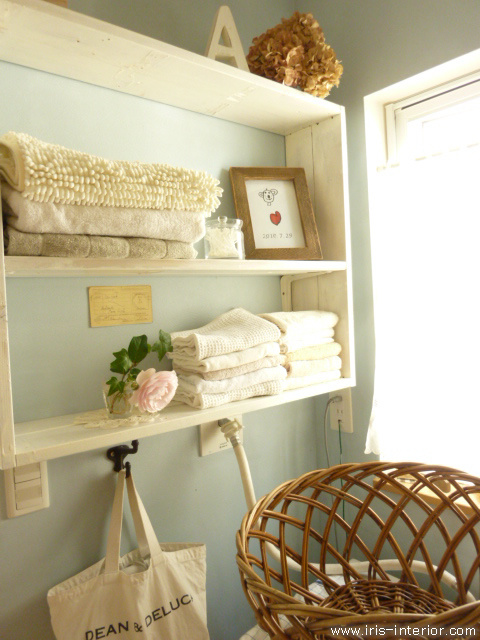 こちらの例では、DIYした棚板の上にボーダーのバスケットを置き、ドライヤーやコテなどのヘアケアグッズを収納しています。統一感があってとってもおしゃれ!オープン棚は収納スペースが増えるだけでなく、取り出しやすいのも嬉しいですね。