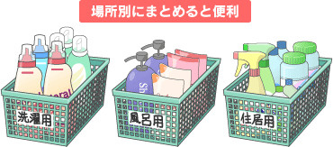 ストックは、カゴにまとめると取り出しやすくなります。洗濯用・お風呂用、