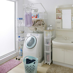 ランドリーラックを使い、洗濯機上のスペースを活用するとコンパクトに収納量を増やせます!