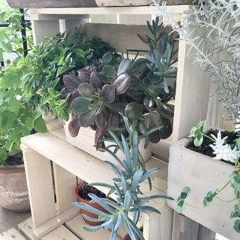 ウッドボックスを重ねて、植物や小物を置くアイデアも素敵です。