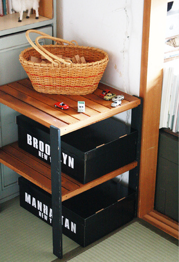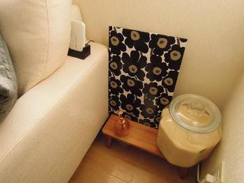 さらにすっきりさせるために、北欧風の布を籠の上にかけています。