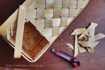 ナチュラルな雰囲気のバスケットの一部にカッターで配線用の穴を開けます。