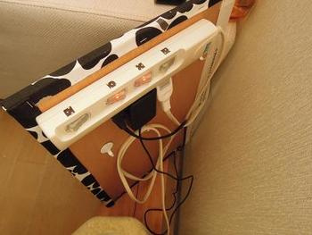 ファブリックパネルの裏側の板のところにネジを差して、そこにコンセントタップを引っかけています。